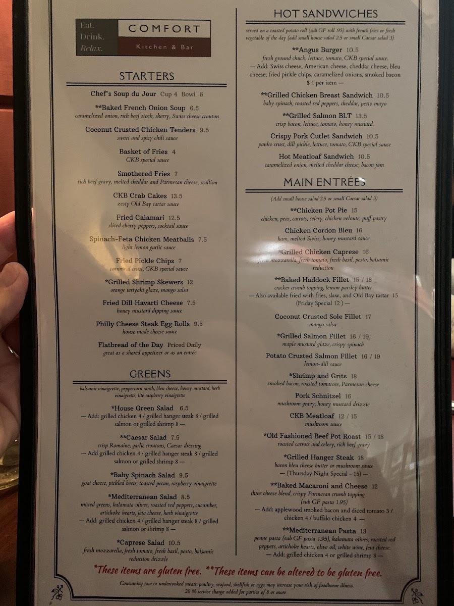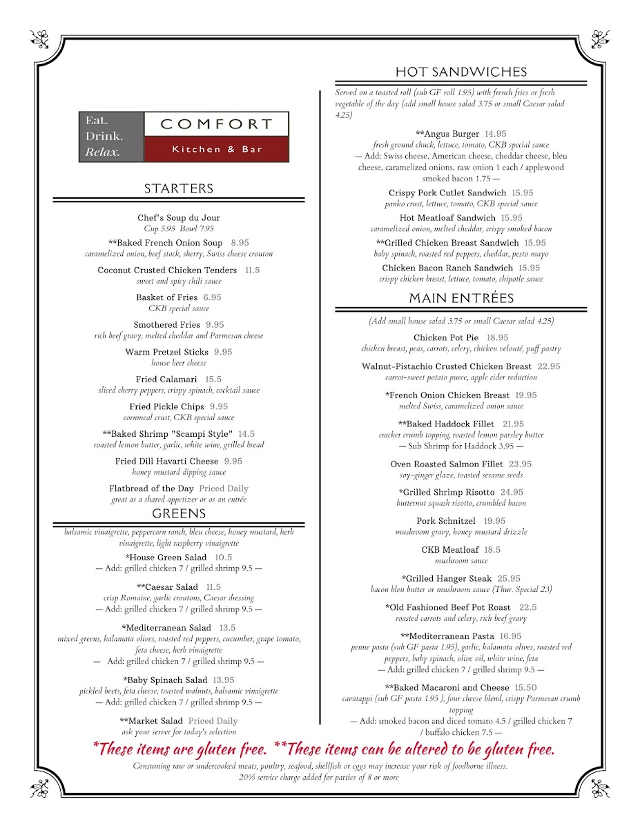 At Comfort Kitchen & Bar, the menu is a reflection of classic flavors and comforting favorites with a modern twist. From savory breakfast dishes to hearty entrees, every item is crafted to satisfy your cravings. Whether you're in the mood for a rich, creamy mac and cheese or a perfectly grilled steak, there's something to please every palate. The diverse selection also includes vibrant salads and freshly made sandwiches, perfect for a light bite or a satisfying meal. Each dish is prepared with care, using fresh ingredients that bring out the best of comfort food. Whether you're enjoying a casual meal with friends or grabbing a quick lunch, the Comfort Kitchen & Bar Menu promises a delightful experience, full of flavor and warmth.